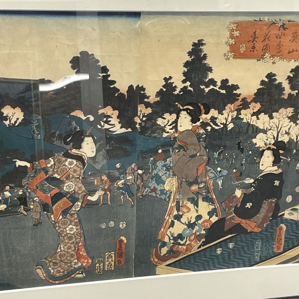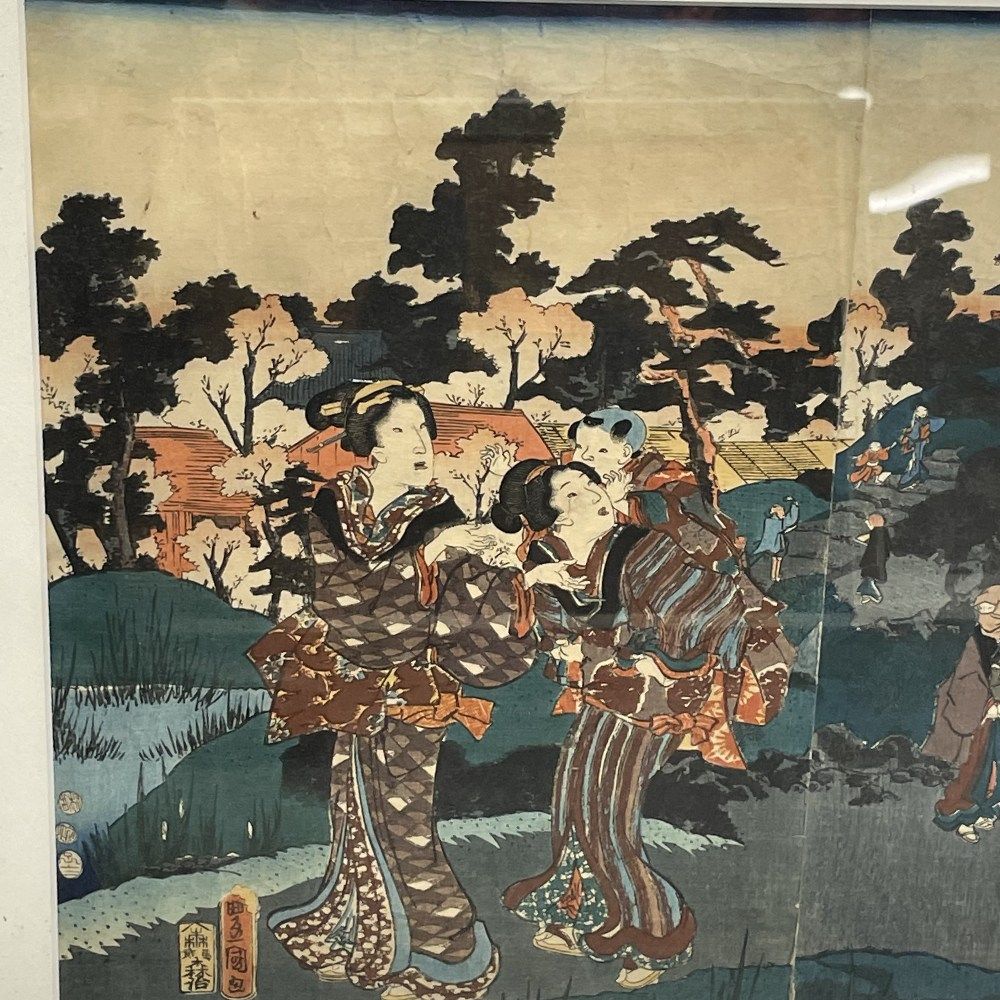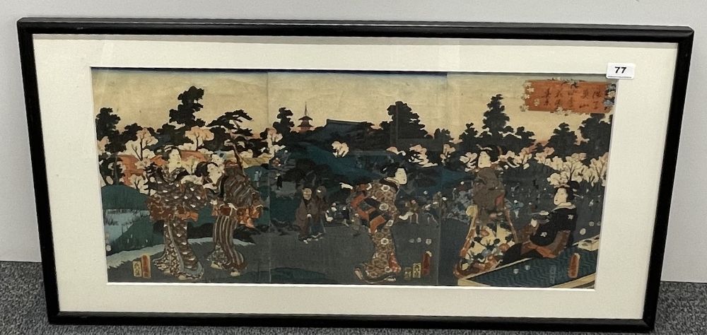 A large framed 19th century three panel Japanese woodblock print of a park scene, 93 x 48cm.