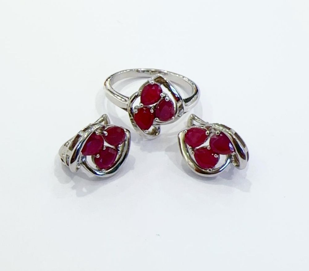 A pair of 925 silver drop earrings set with oval cut rubies, L. 1.8cm, with matching 925 silver ring set with oval cut rubies.