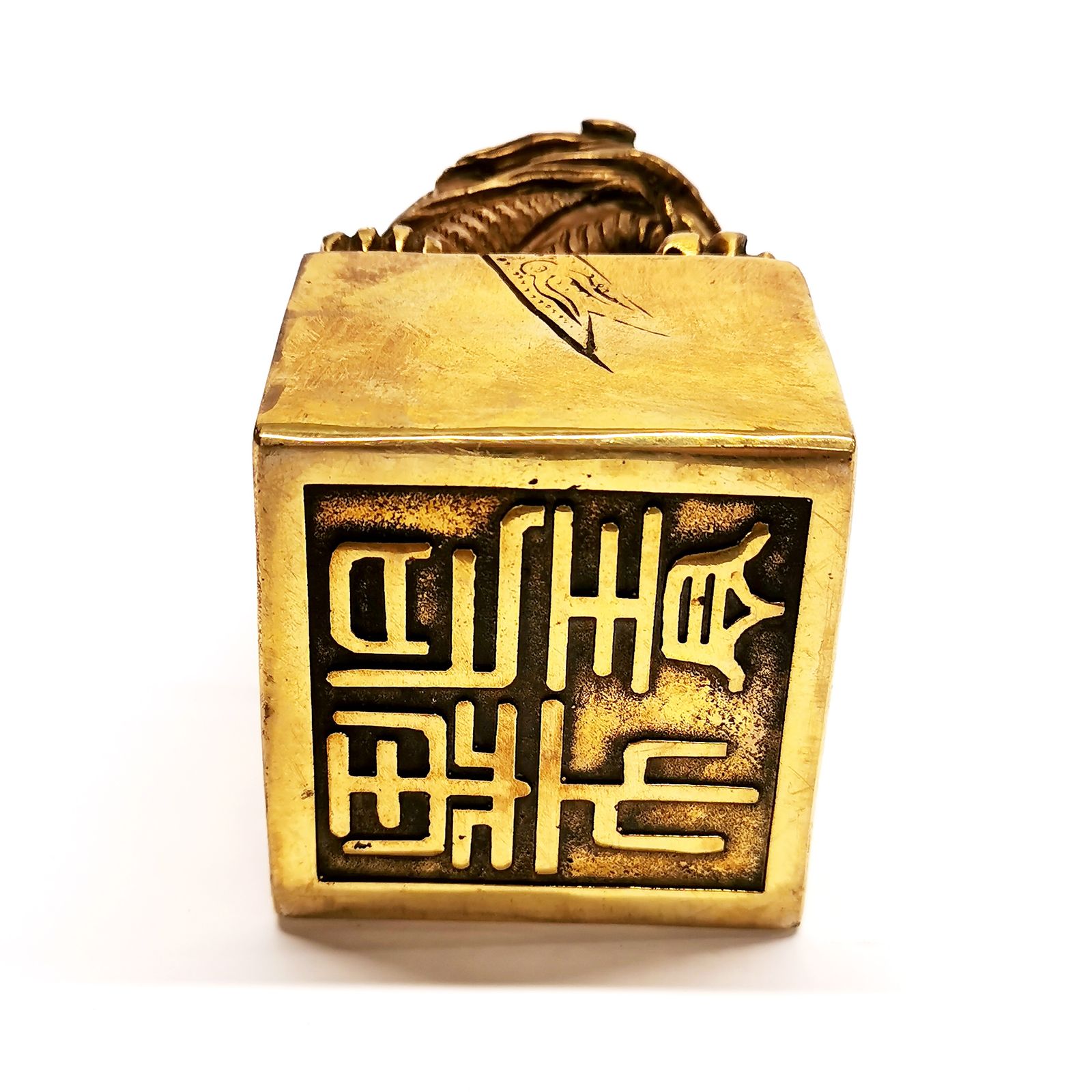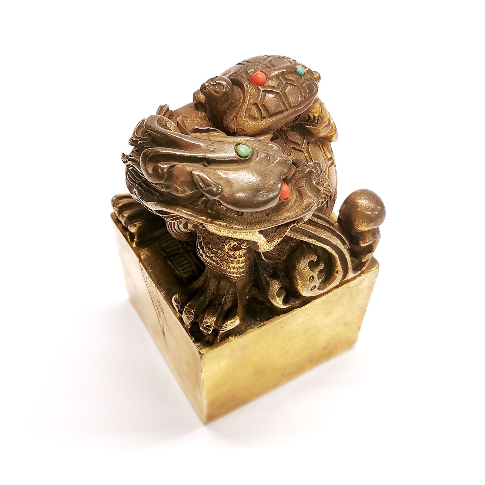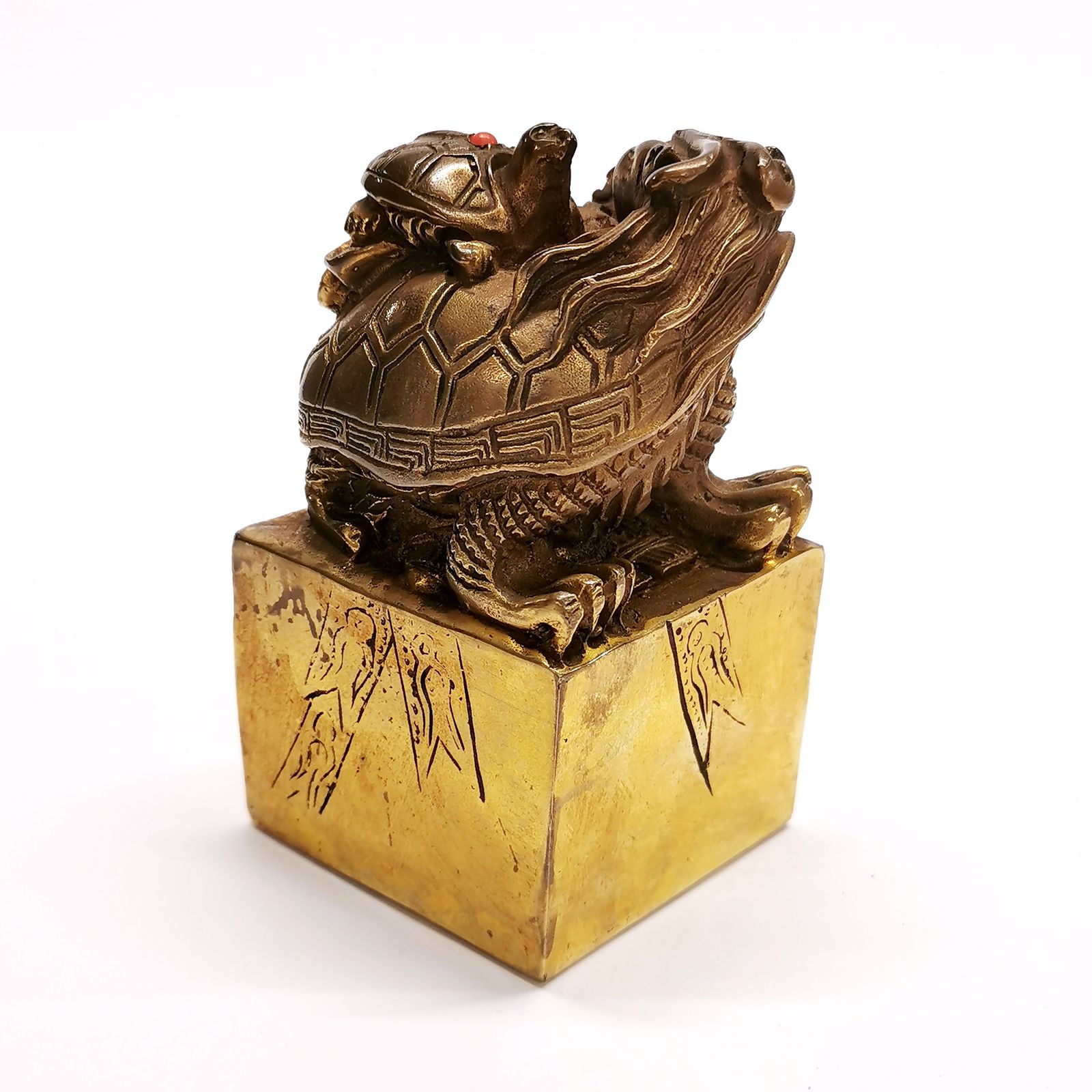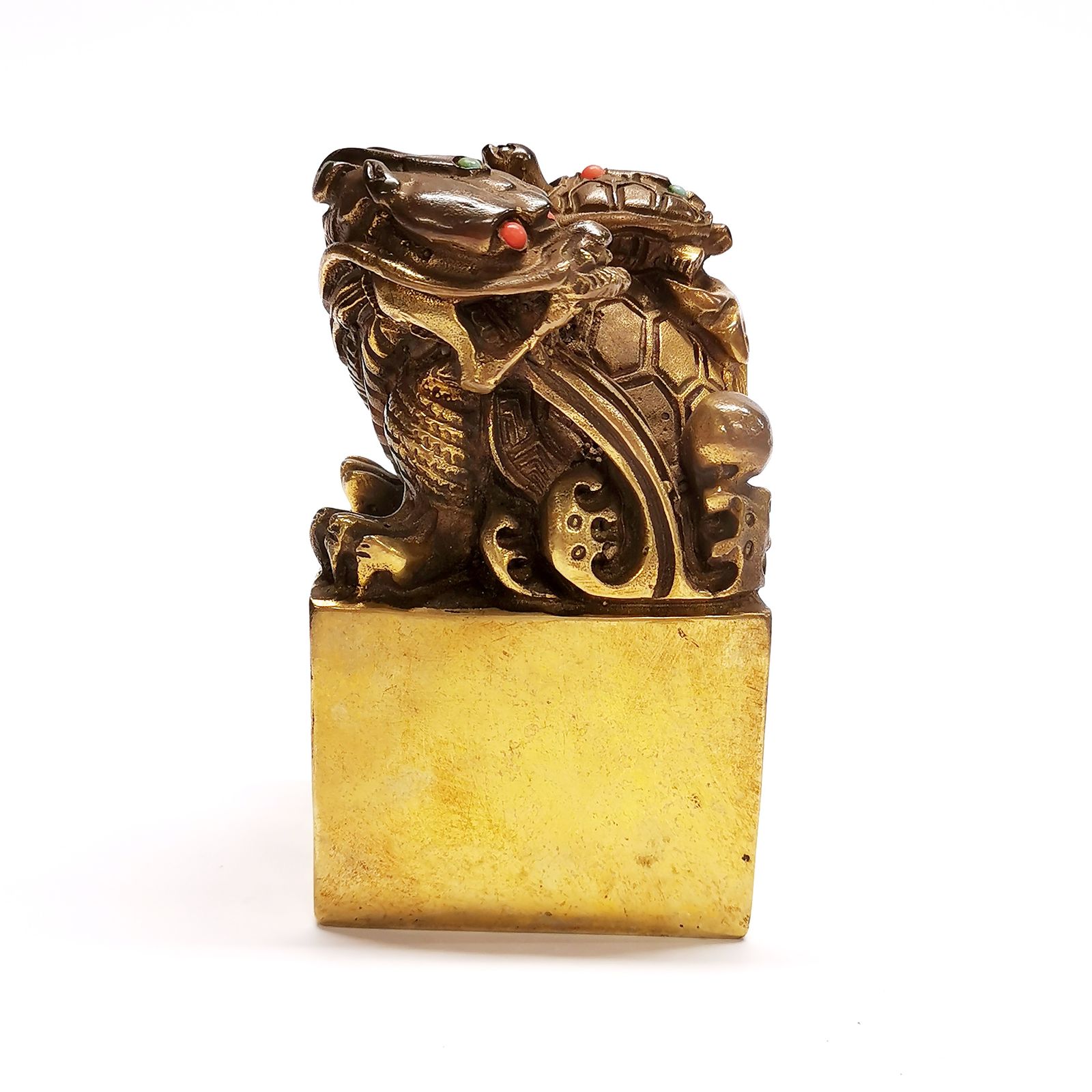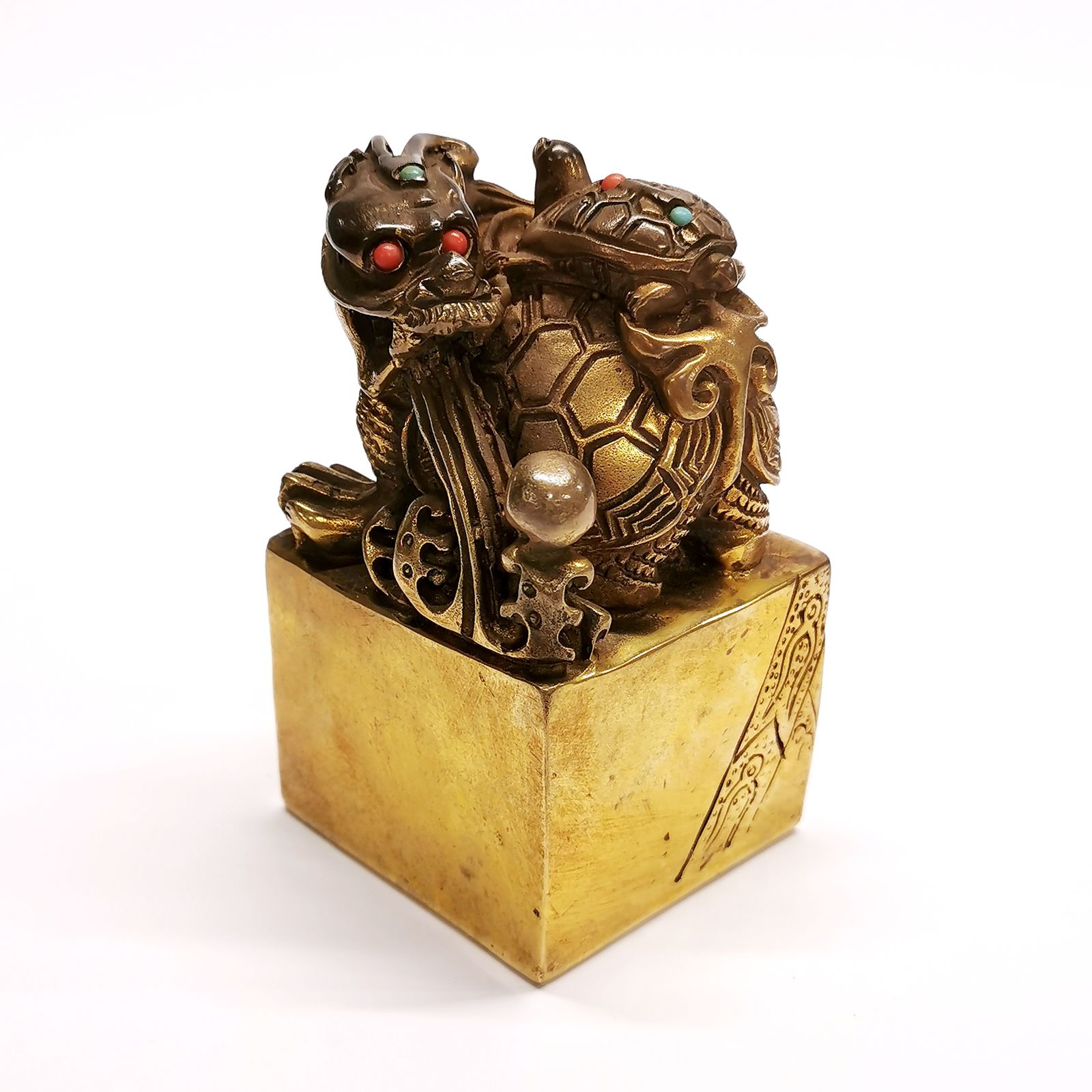 A Chinese jewelled gilt bronze scholar's seal, H. 13cm.ft