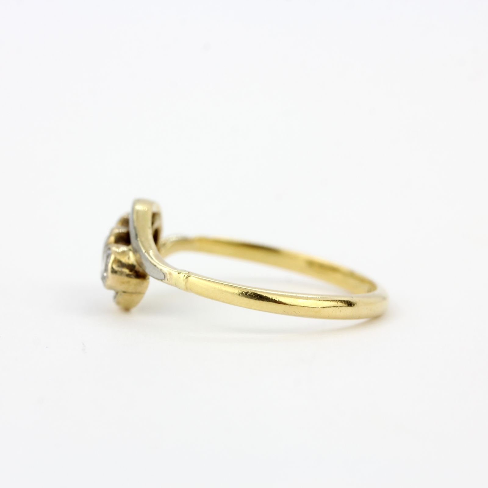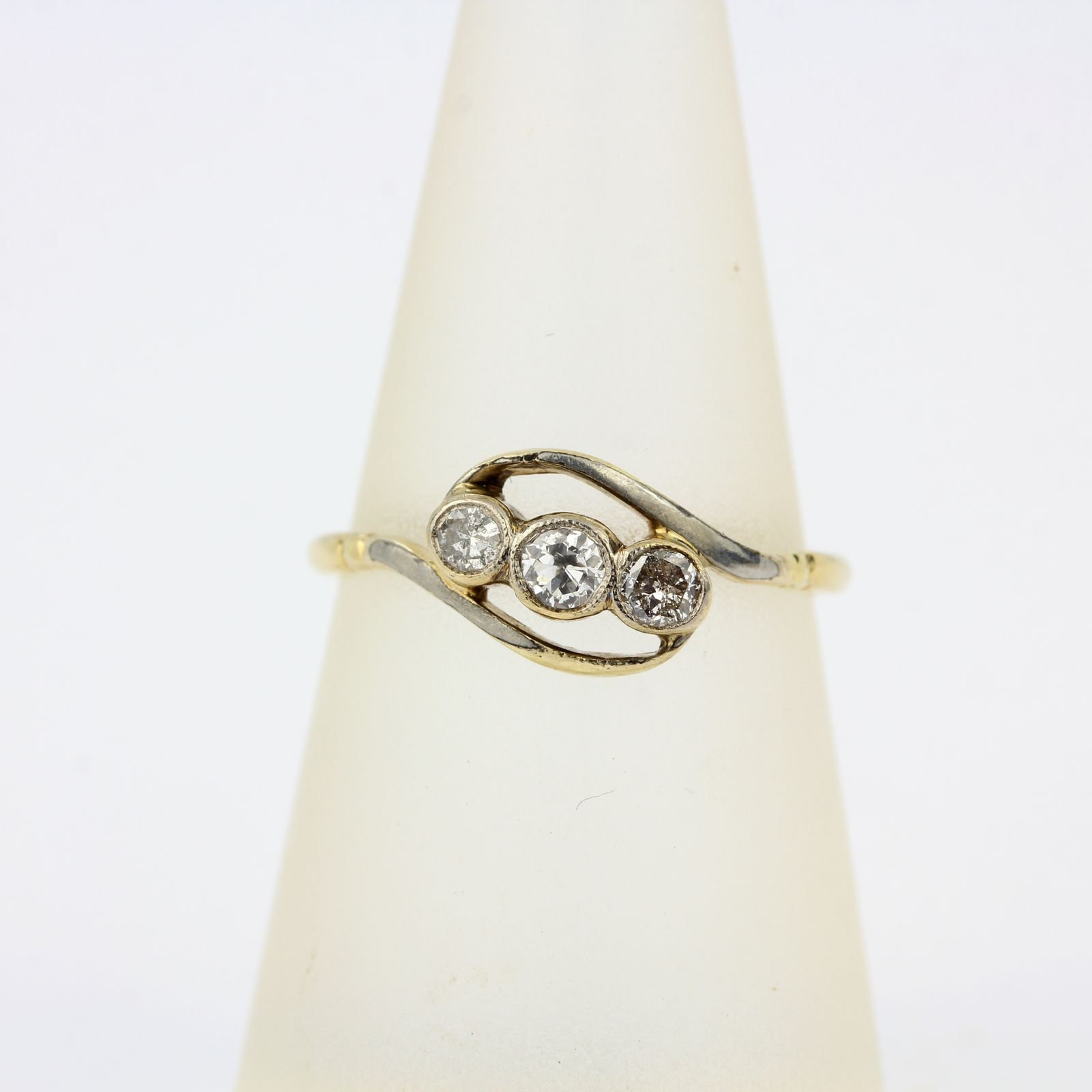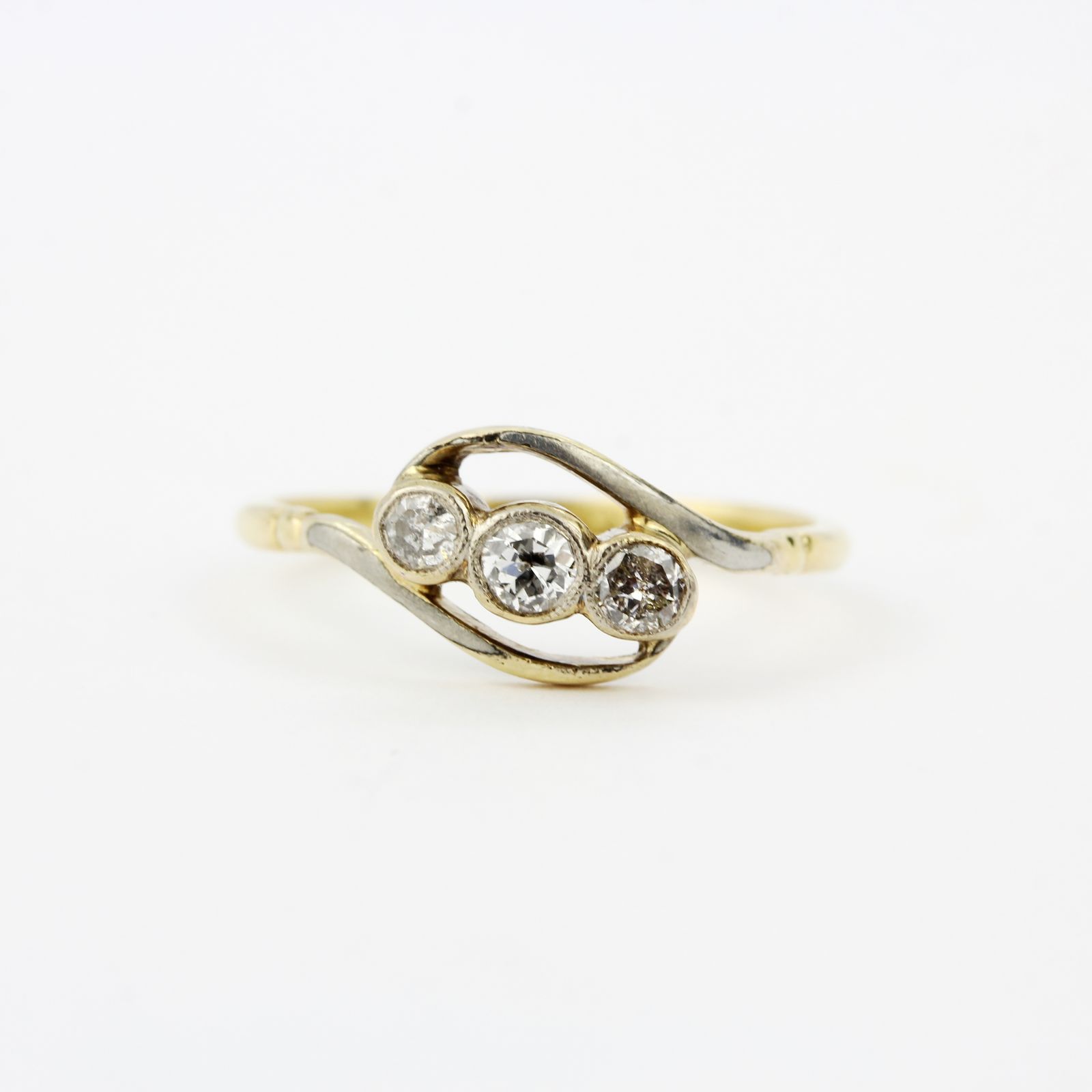 An early 20th century 18ct and platinum crossover ring set with three brilliant cut diamonds, ring size N.